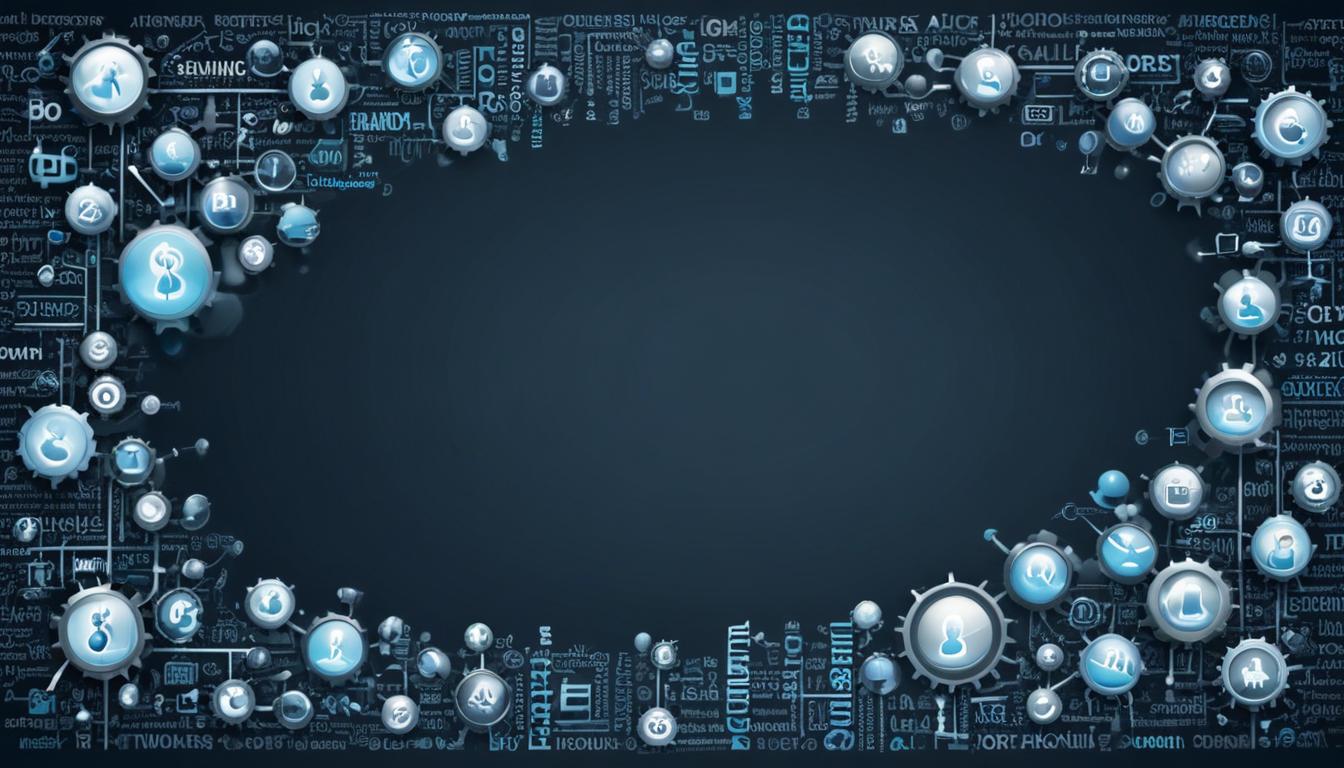 A digital design featuring abstract gears and icons on a dark blue background.