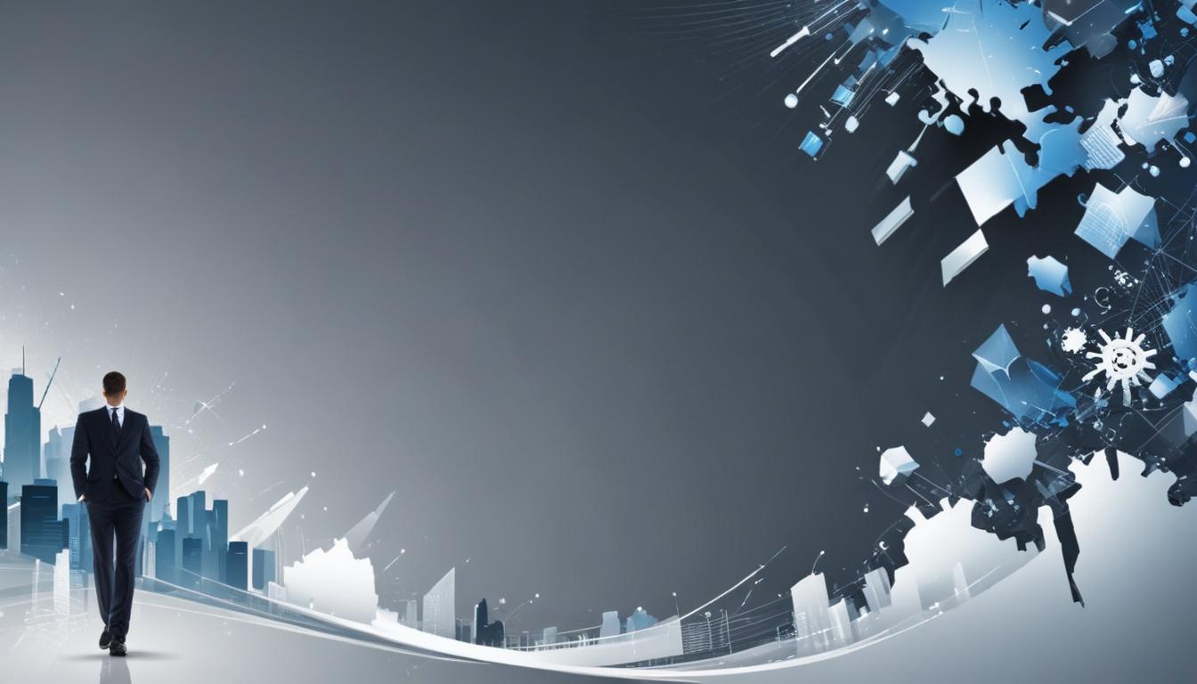 A man in a suit walks towards a stylized, abstract cityscape. The background is a muted gray with hints of blue.