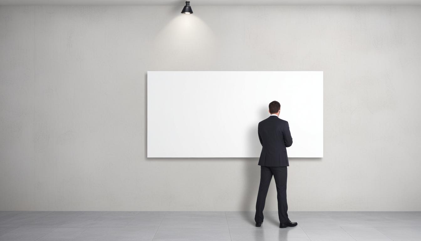 A man in a black suit stands before a blank whiteboard, arms crossed, gazing at it in an empty, white-lit room