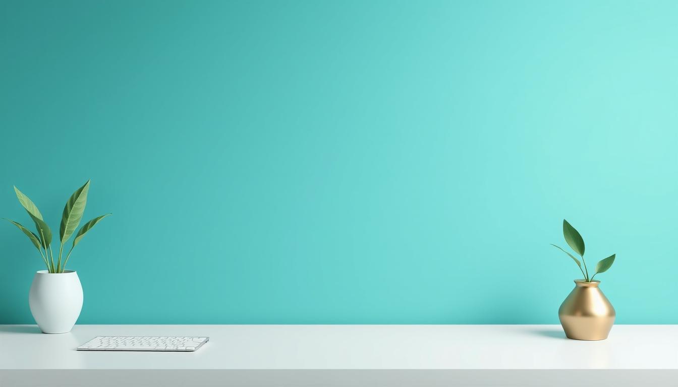 background, decoration, design, desk, gold, green, home, interior, keyboard, minimal, modern, office, plant, pot, space, surface, teal, wall, white, work