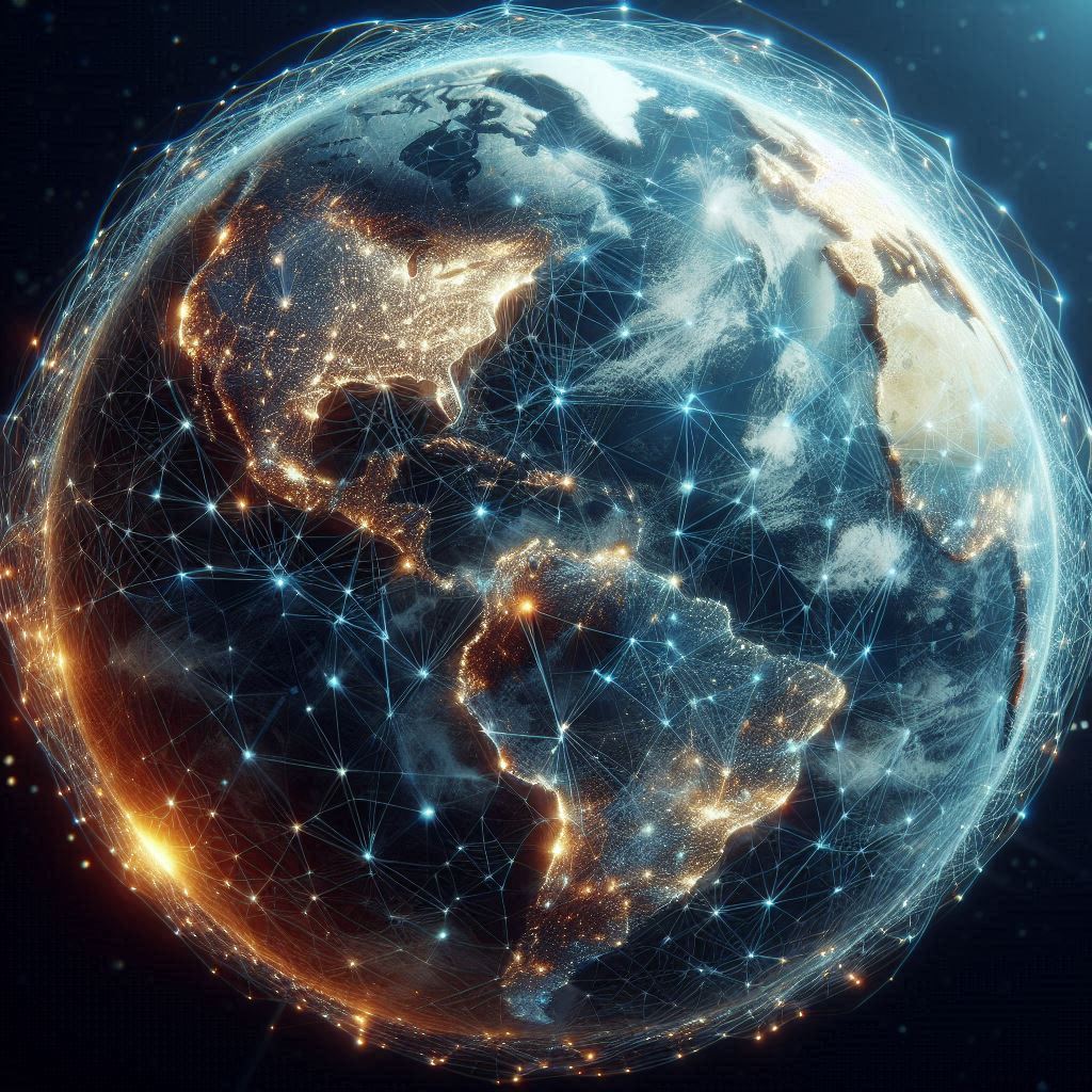 An illustration of the Earth at night with city lights and a network of glowing lines connecting different parts of the globe.