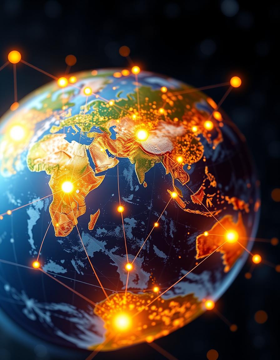 A digital representation of the Earth with bright lines connecting various locations, symbolizing the interconnectedness of the world.