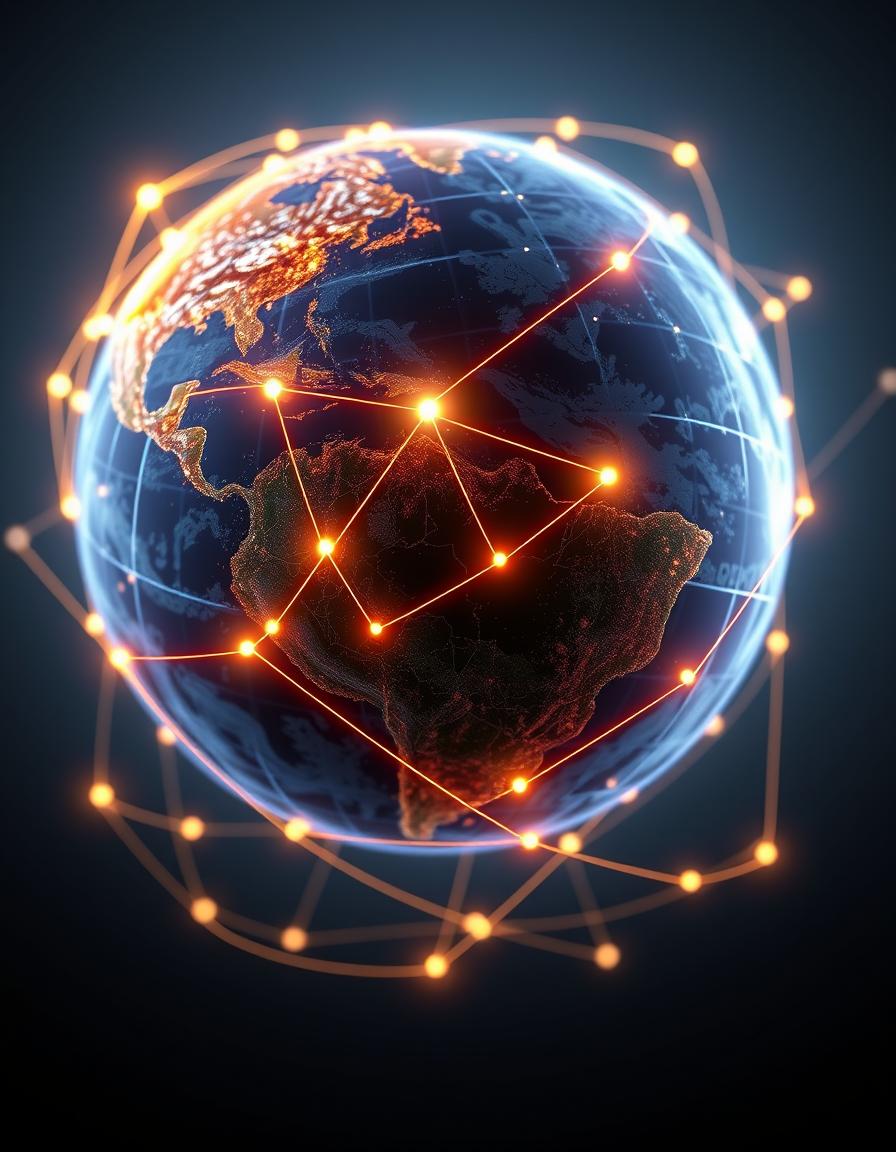 A digital illustration of Earth with glowing orange lines connecting its regions, set against a dark blue space backdrop