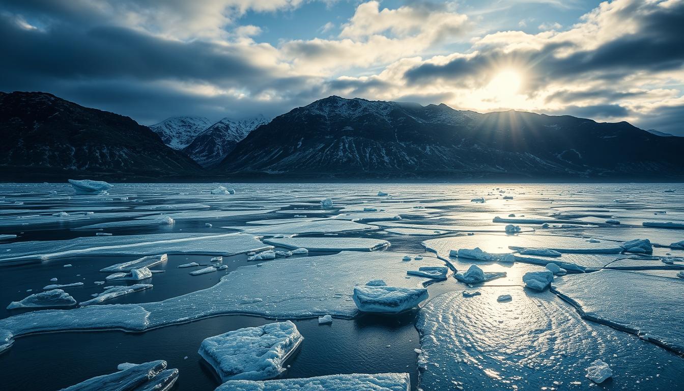 A frozen lake with ice floes and mountains in the background. The sun is shining through the clouds.