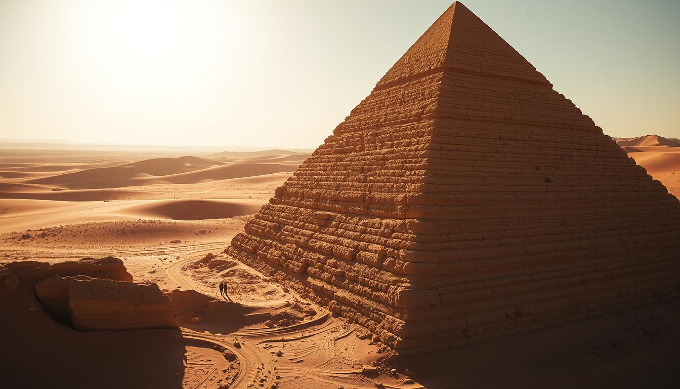 A tall, stone pyramid stands in a large desert with sand dunes. Two people are walking in the distance. The sun is shining brightly.