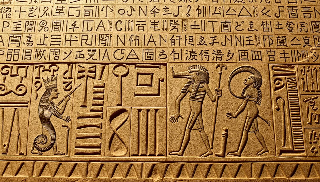 Hieroglyphics on a stone wall depict a woman and two men, one with a bird head, all holding staffs