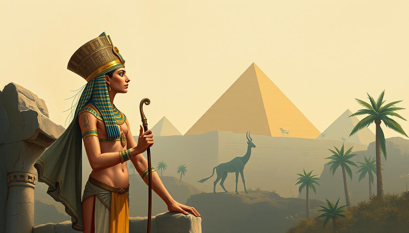 A pharaoh in traditional clothing stands on a ledge overlooking a desert landscape with a large pyramid in the background.