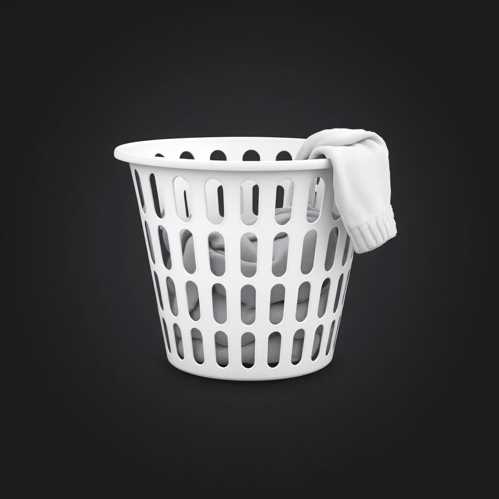 A white laundry basket with clothes inside, sitting on a black surface. A sock hangs over the edge of the basket.