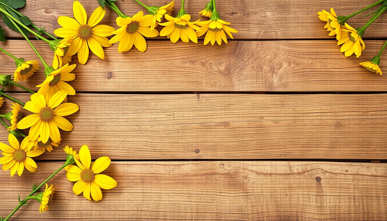 A cluster of bright yellow flowers decorates a light brown wooden surface, bordered on the left and right by several blooms