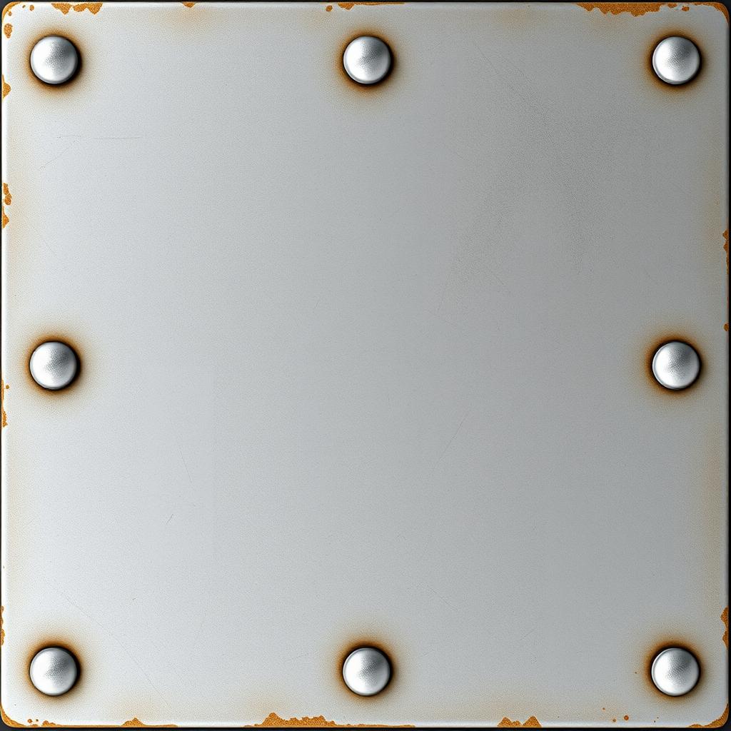 A square-shaped, silver metal plate with six circular, silver rivets set into its surface, with visible rust around the rivets and on the edges.