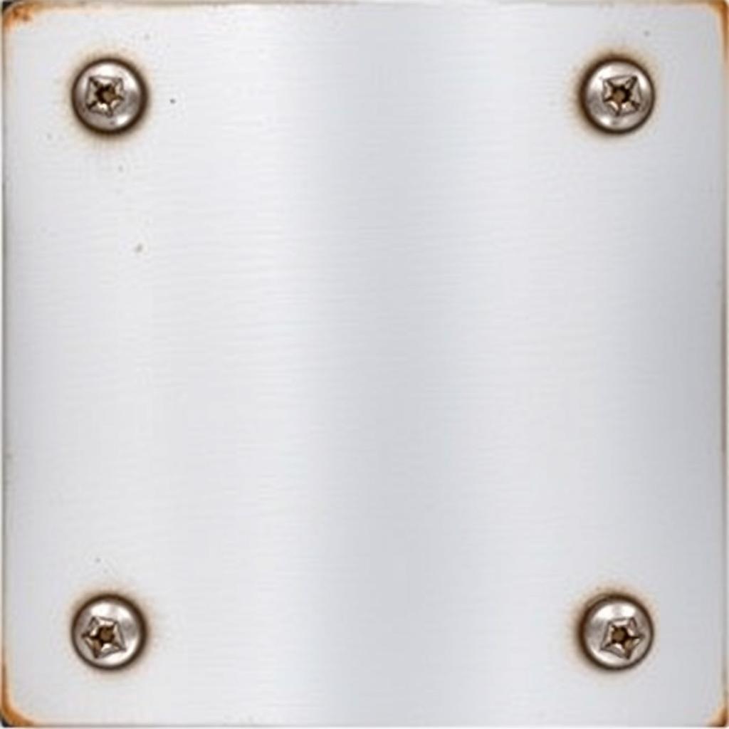 A close-up of a silver plate with four screws on the edges.
