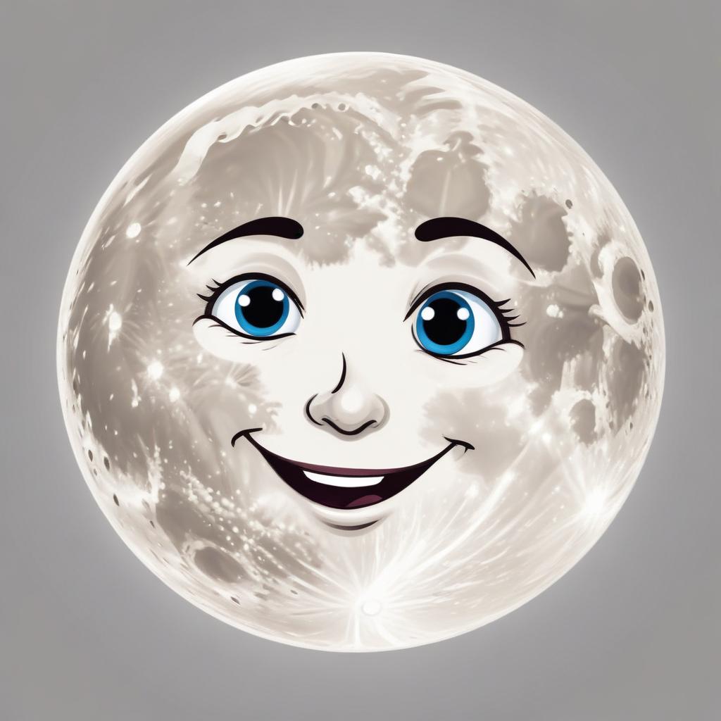 A cartoon illustration of the moon with a smiling face and blue eyes.