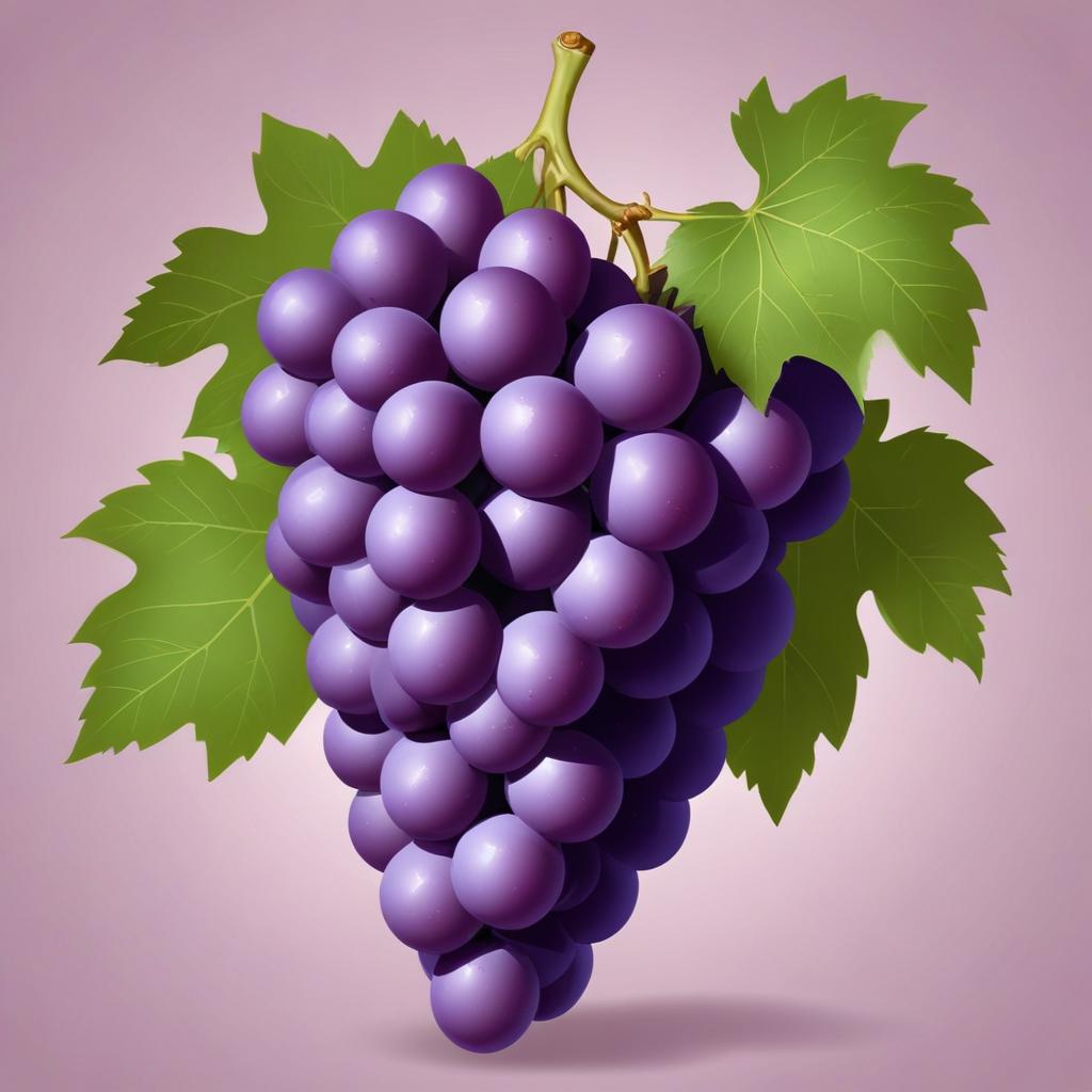 A bunch of purple grapes hangs from a vine with green leaves against a light purple background.