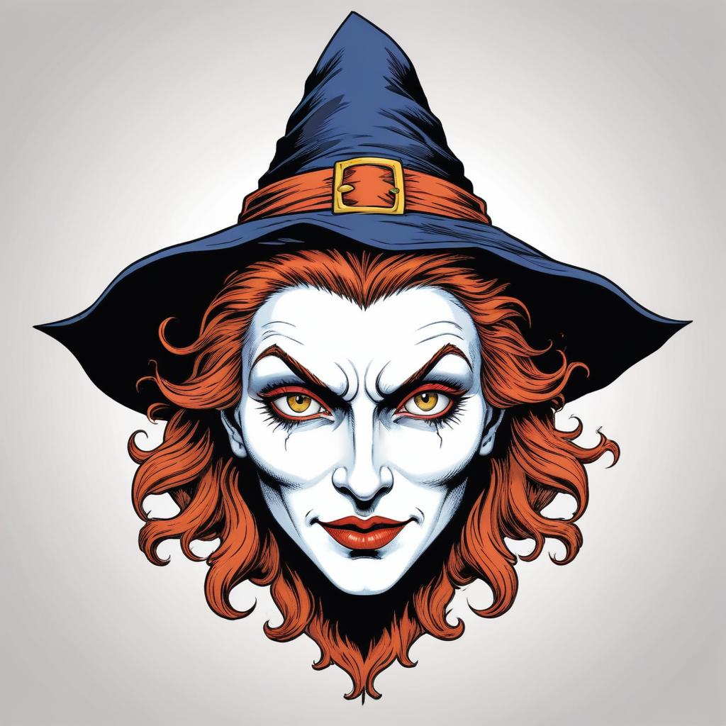 A drawing of a witch with a pointed hat and red hair, staring at the viewer with an intense expression.