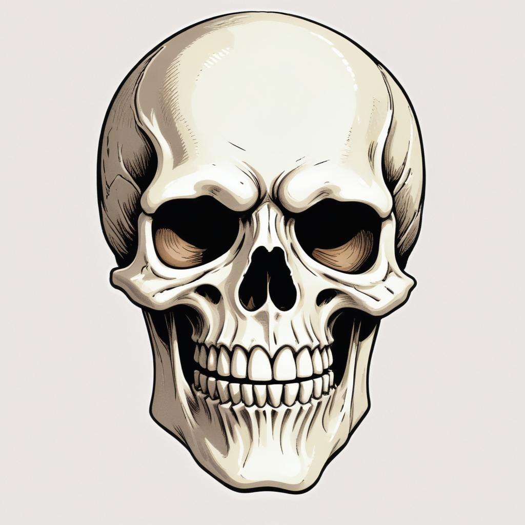 A white skull with a detailed illustration style. The skull has a prominent jawline and a slight smile.