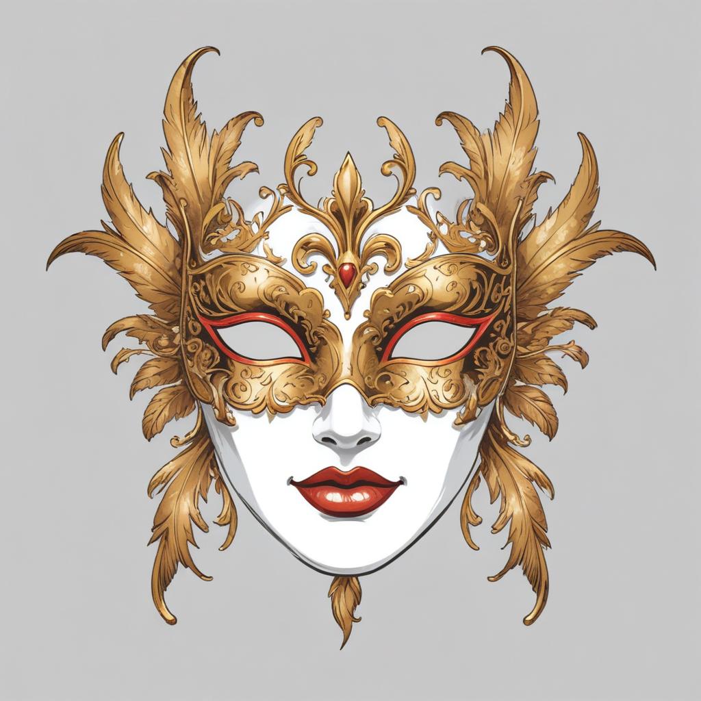 A close-up of an ornate masquerade mask featuring gold and red accents and elaborate feather details.