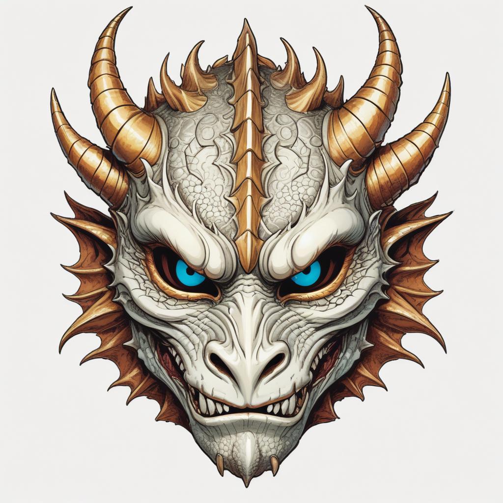 A white dragon with golden horns and blue eyes gazes fiercely at the viewer, showcasing sharp teeth