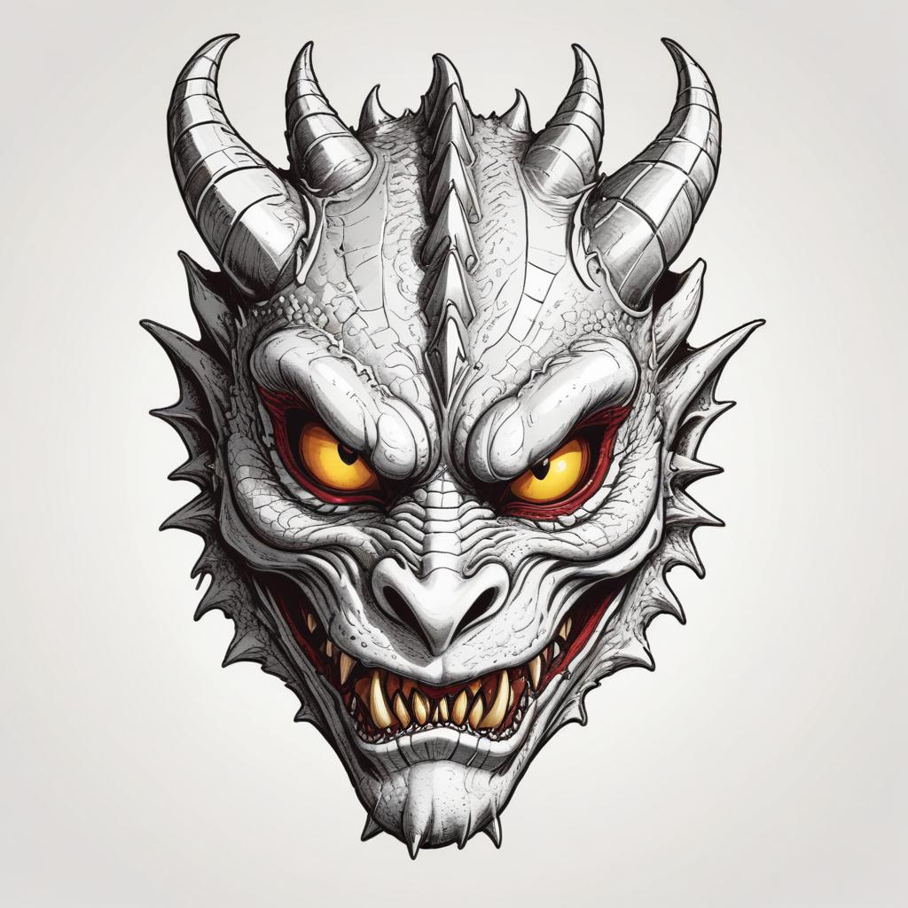 A detailed illustration of a dragon's face with sharp teeth and yellow eyes.