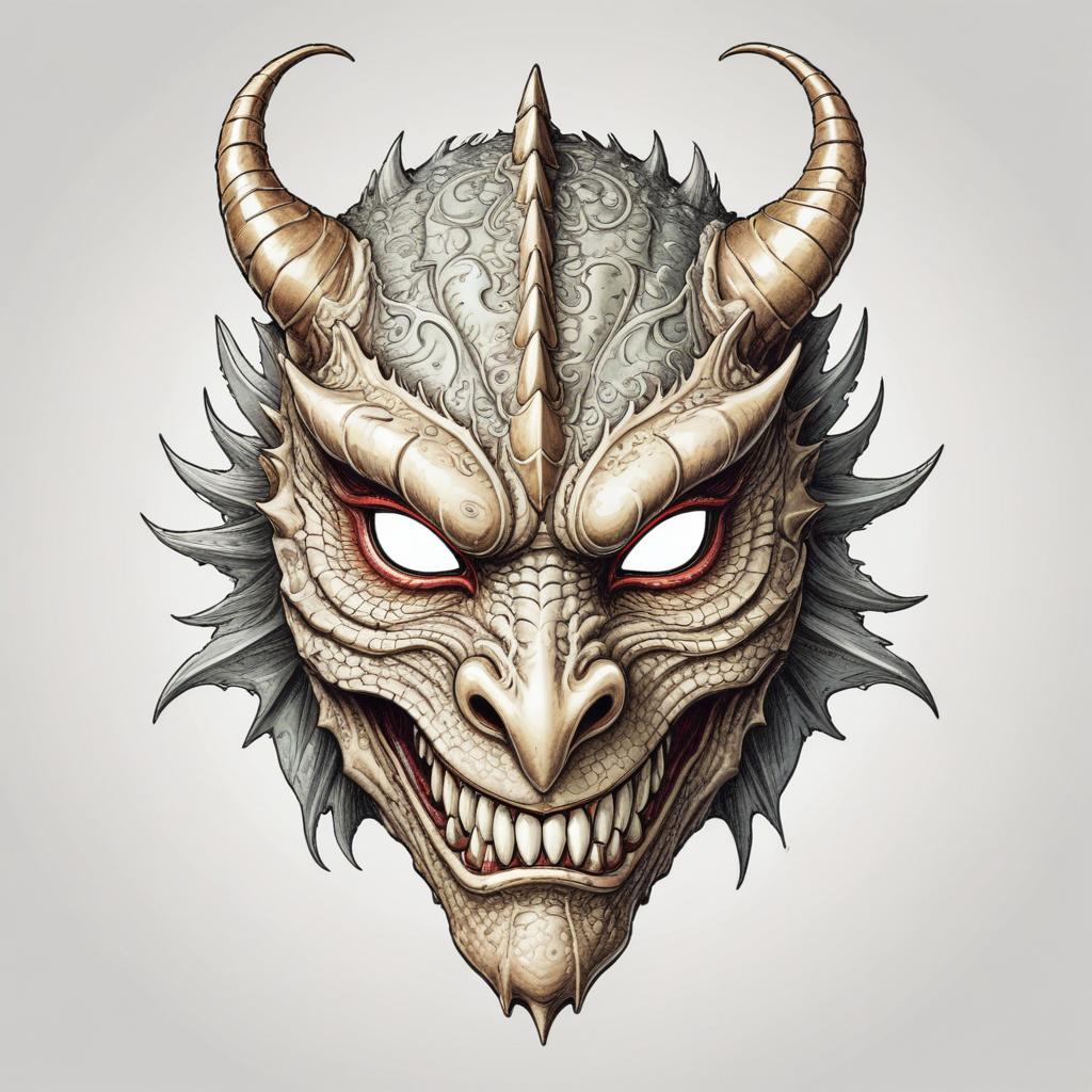 A close-up illustration of a dragon mask with sharp horns, white eyes, and a toothy grin.