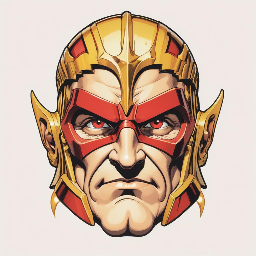angry, art, book, character, comic, comics, eyes, face, flash, gold, helmet, illustration, mask, red, reverse, speedster, superhero, supervillain, universe, villain