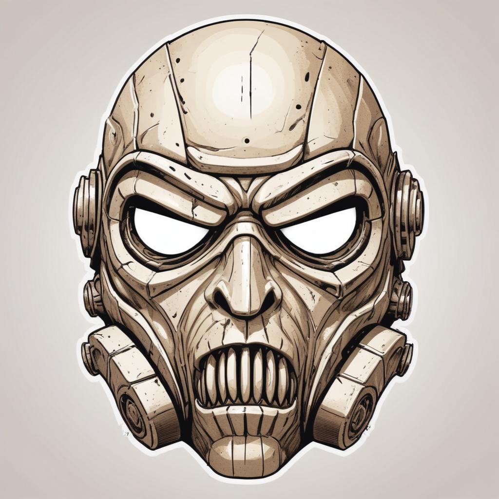 A detailed, black and white illustration of a robotic skull, seen from the front, featuring a menacing expression with sharp teeth.
