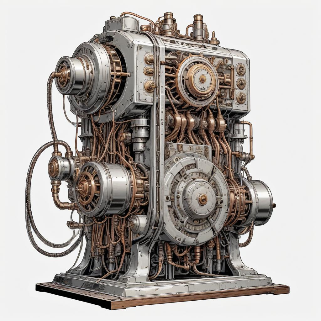 An intricate, detailed illustration of a large, complex machine made of gears, pipes, and wires.