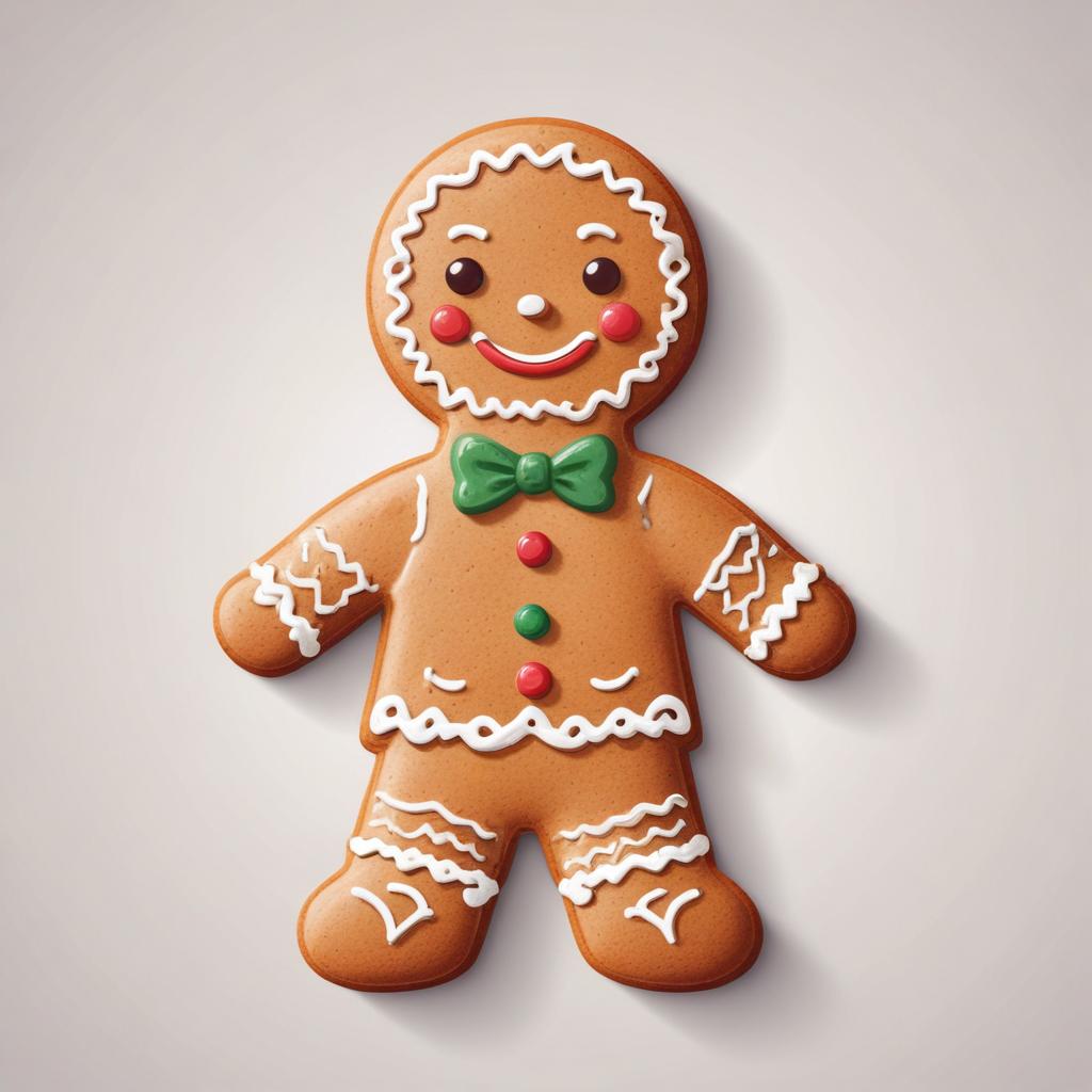 A gingerbread man with a green bow tie, white icing, and red & green buttons stands out on a white background