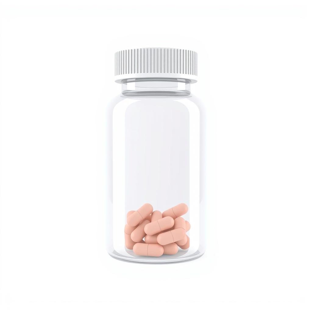 A glass bottle with a white lid contains a small amount of pink pills.