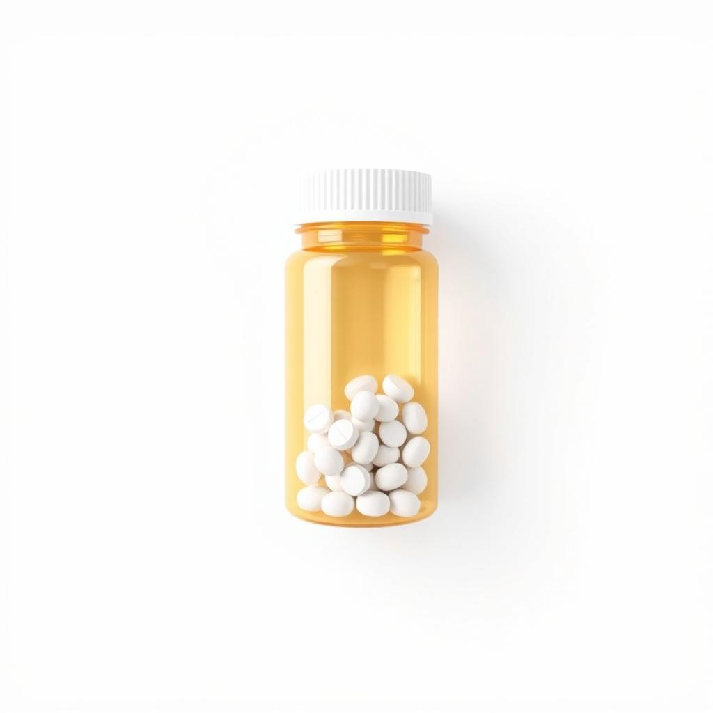 A white bottle filled with white pills on a white background