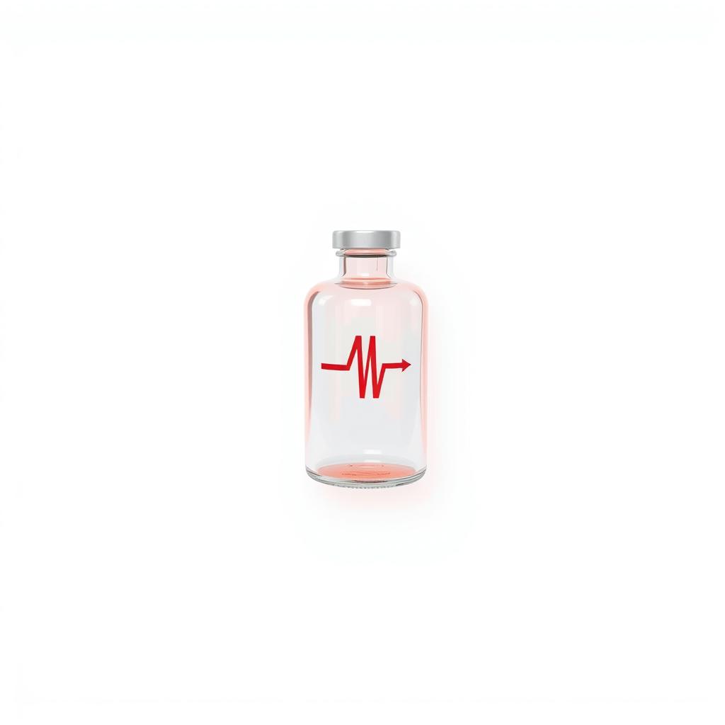 A clear glass vial with a silver lid and a red heartbeat symbol on the side. The vial is empty and appears to be made of glass.