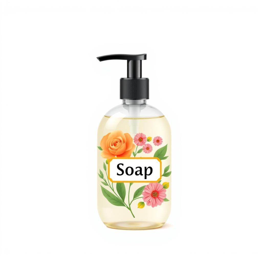Clear liquid soap bottle with a floral design, black pump, and a yellow label that reads Soap