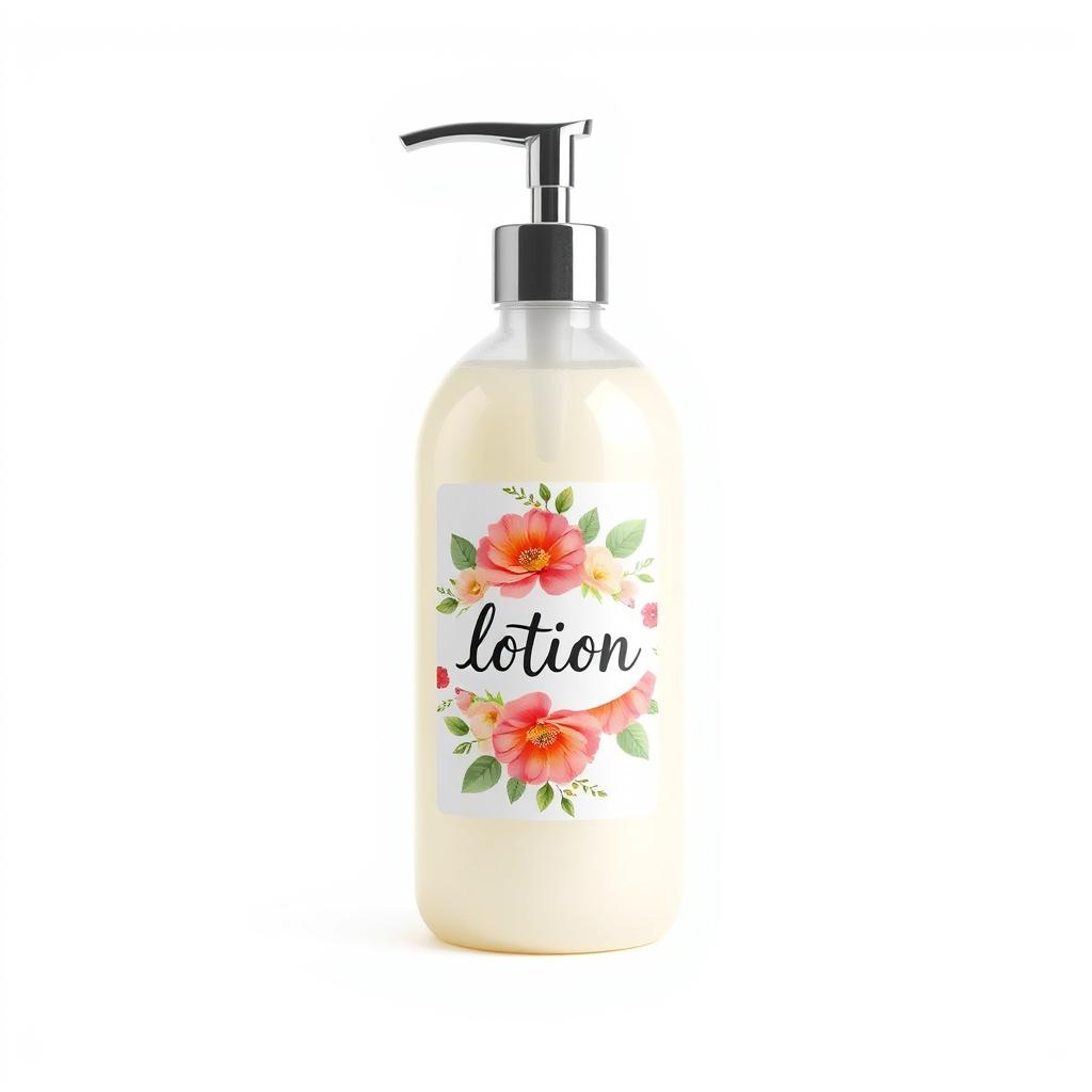 A white bottle with a silver pump dispenser filled with lotion. It has a floral label with the word 'lotion' written in black script.