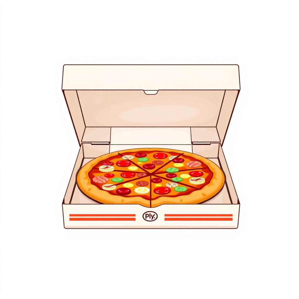 Cartoon of a pizza in an open box, topped with pepperoni, sausage, olives, and green peppers
