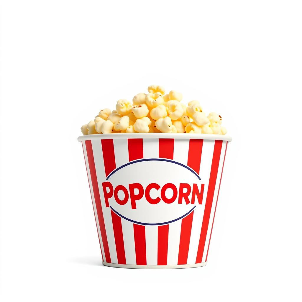 A red and white striped popcorn bucket filled with popcorn sits on a white surface.