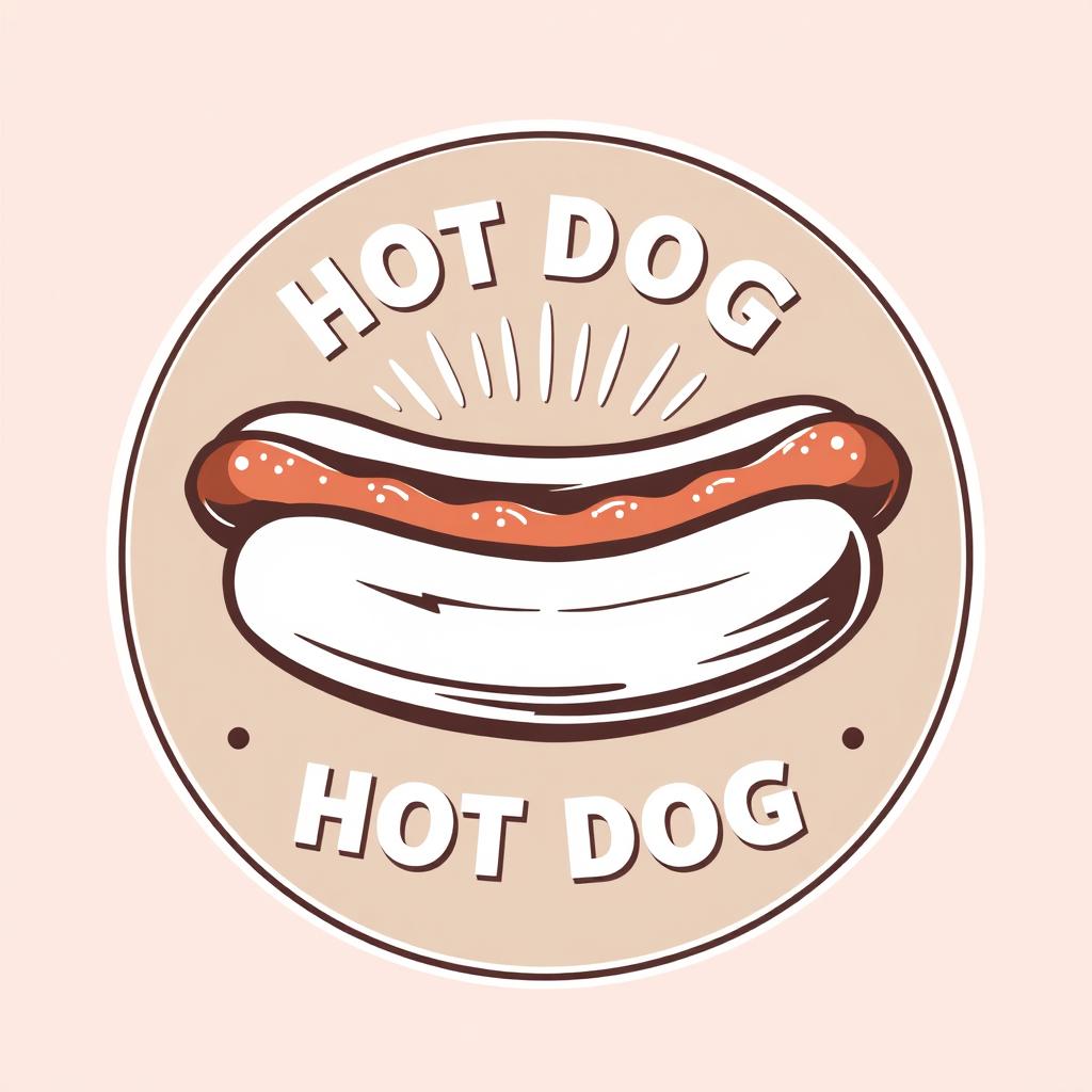 A circular logo with a hot dog in a bun topped with ketchup.