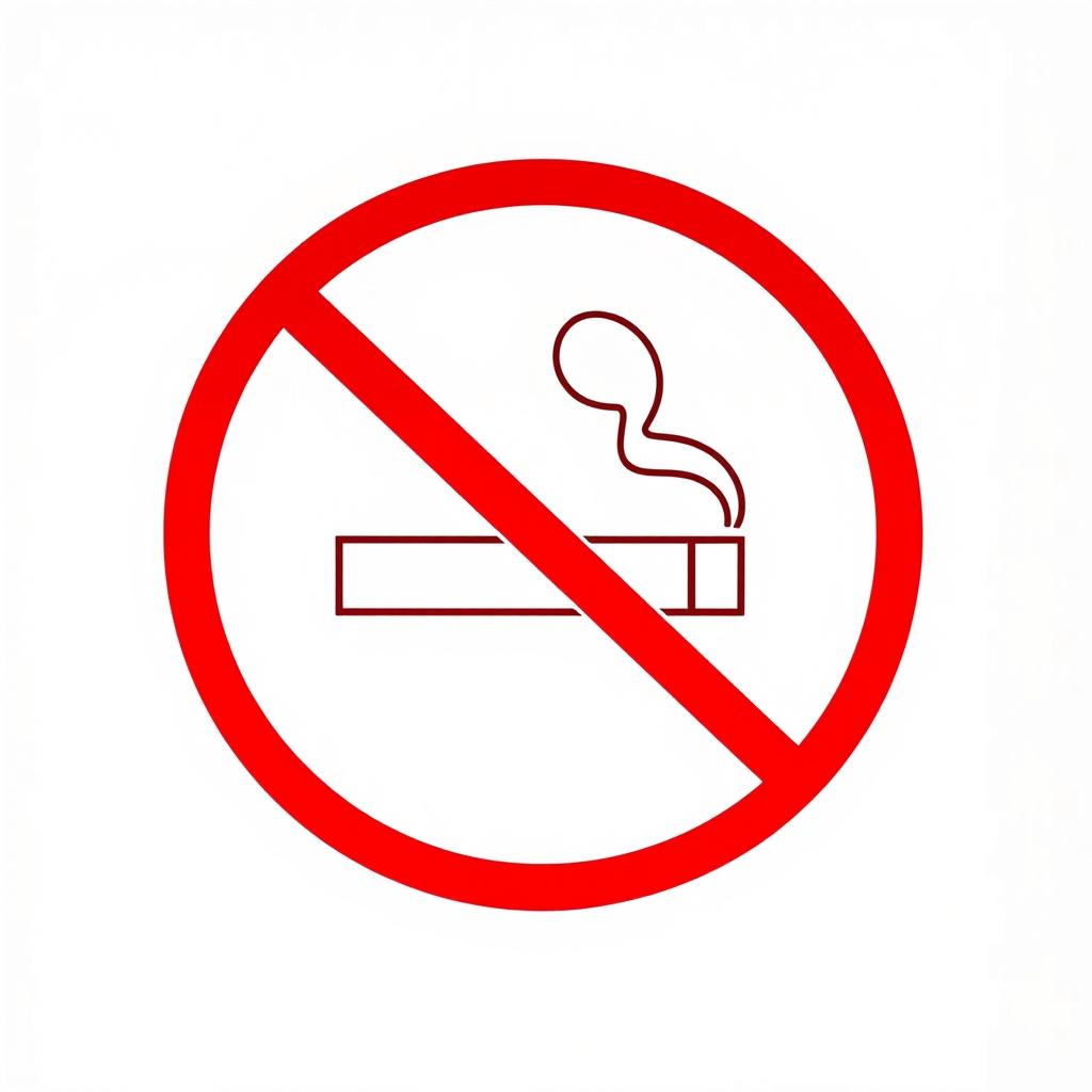 A red circle with a diagonal line through it contains a depiction of a cigarette with smoke.