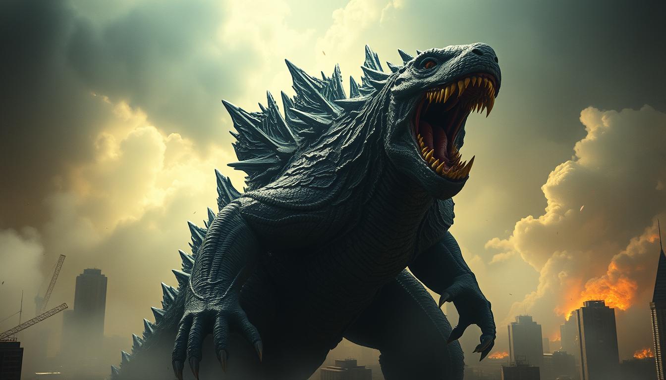 Godzilla roars over a city