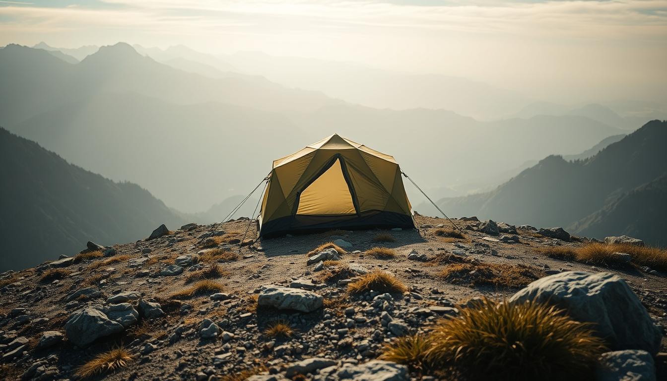 A lone tent is pitched on a rocky mountain top, overlooking a misty landscape. The sun shines brightly, illuminating the scene.