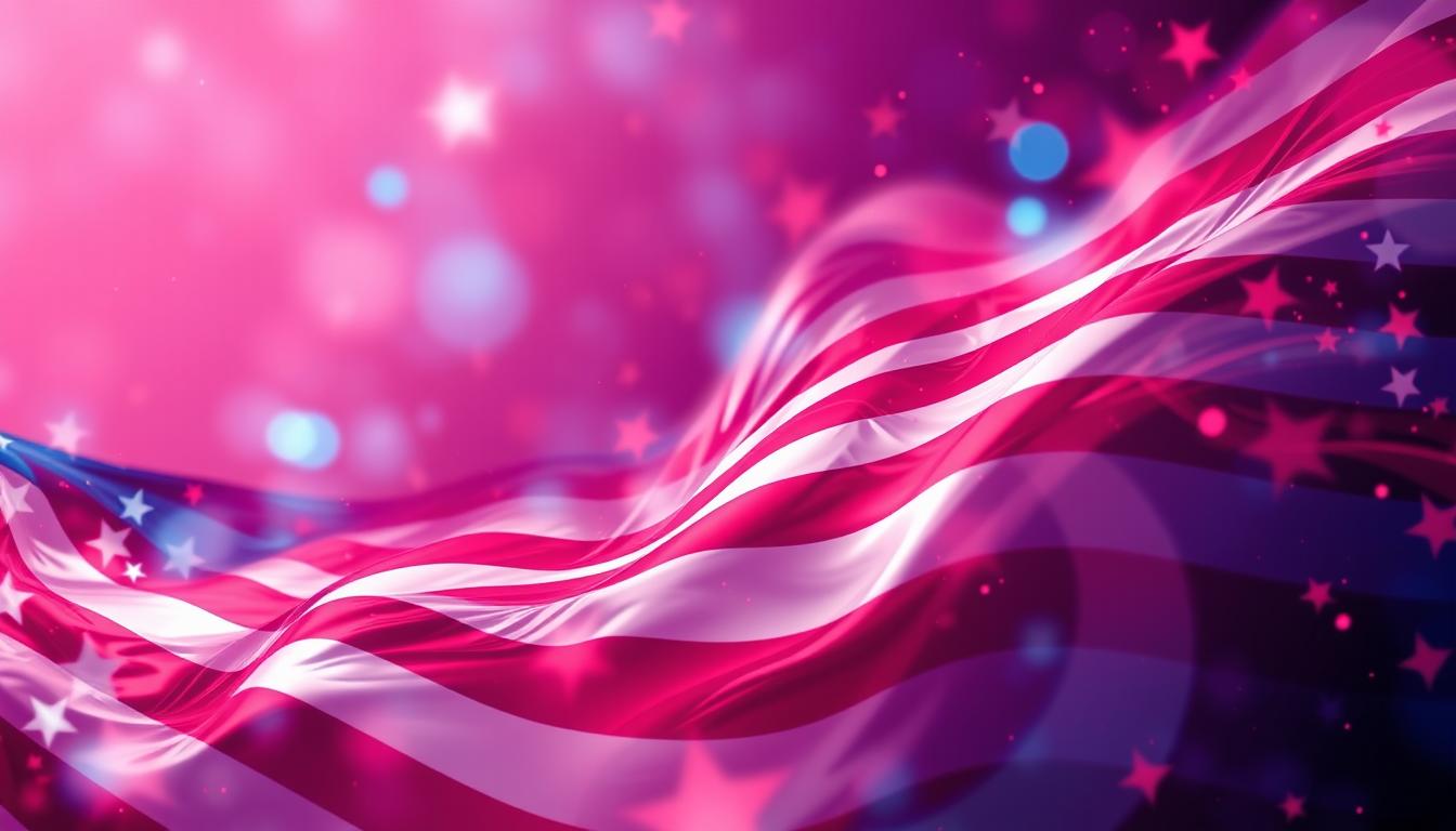 A waving american flag with a pink and purple background