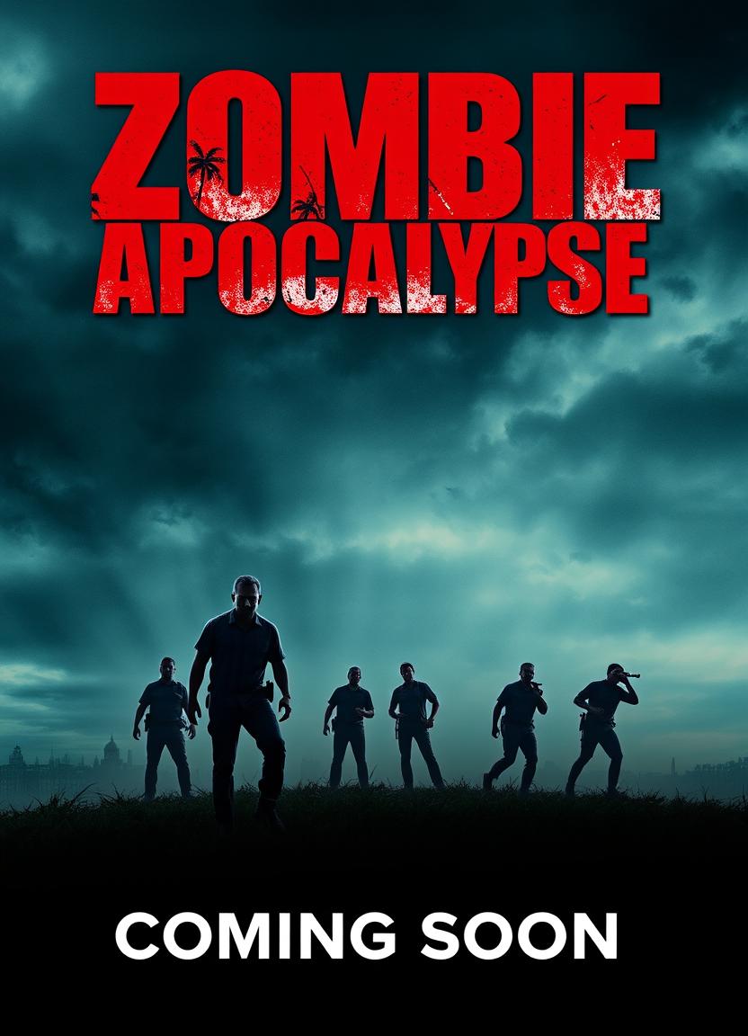 Silhouetted men stand against a stormy blue sky. Zombie Apocalypse in red above, Coming Soon at the bottom