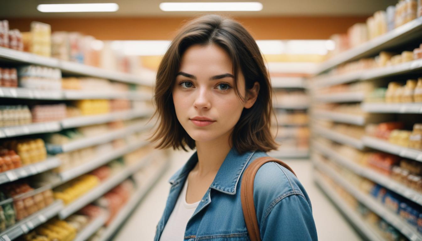 A young woman with dark brown hair, wearing a blue denim jacket and a white t-shirt, looks at the camera from the aisle of a grocery store.