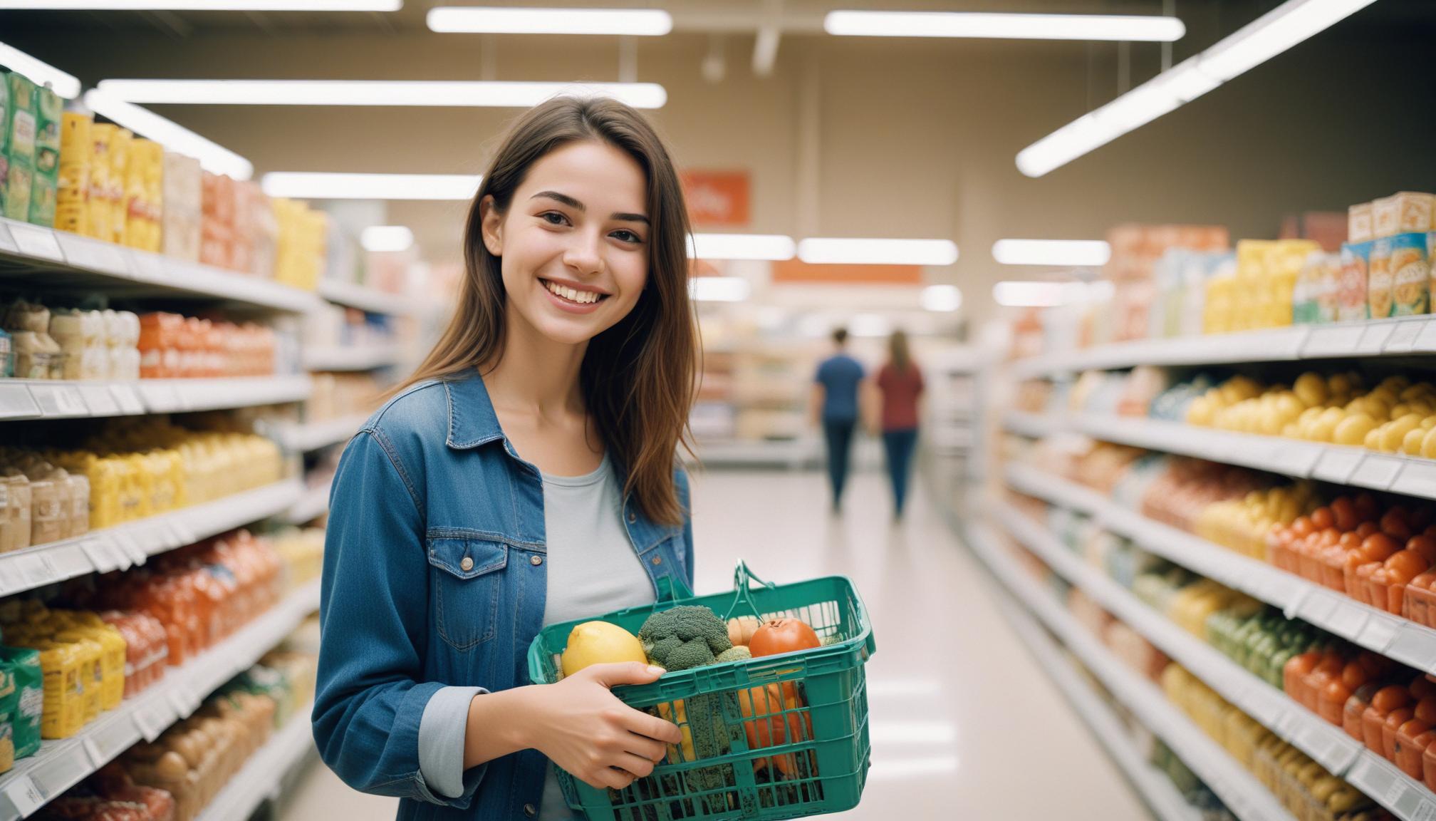 A woman with long brown hair in a blue denim jacket smiles while holding a green basket of fresh produce in a grocery store aisle