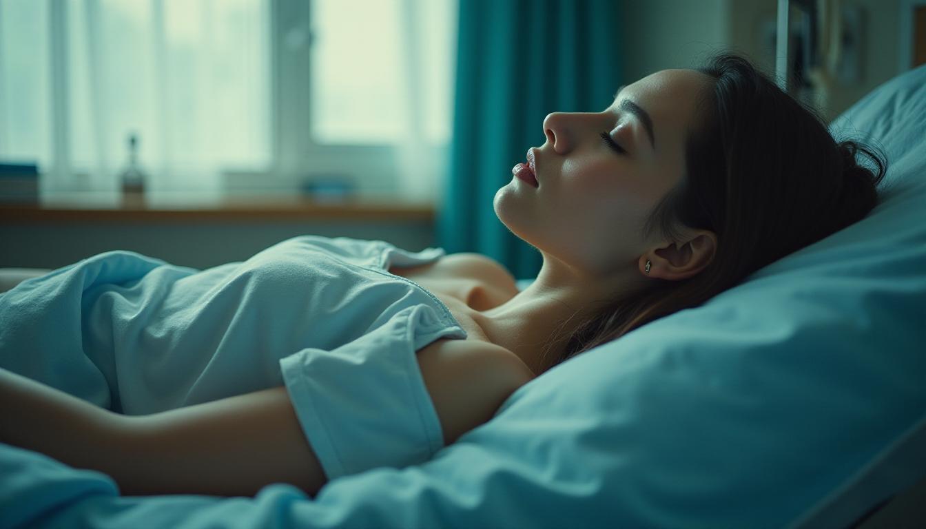 A woman with long dark hair lies in a hospital bed, wearing a light blue gown. Her eyes are closed, and she appears to be sleeping.