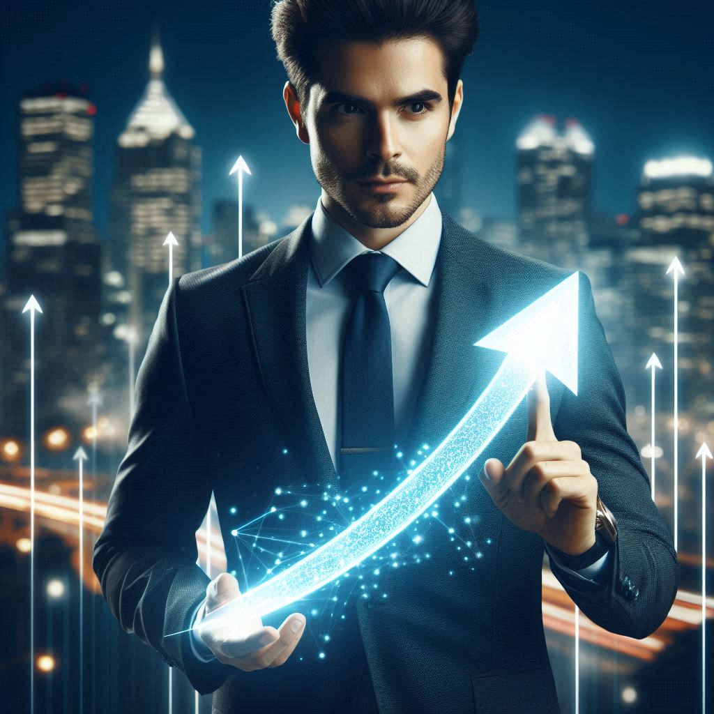 A man in a suit stands in front of a cityscape at night. He is holding a glowing blue arrow in his hands, which represents growth and success.