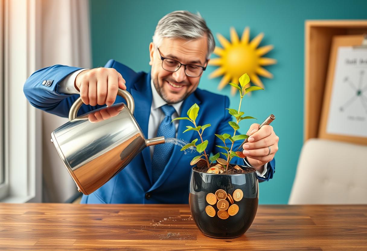 A man wearing a blue suit and glasses smiles as he waters a plant growing from a pot filled with coins.