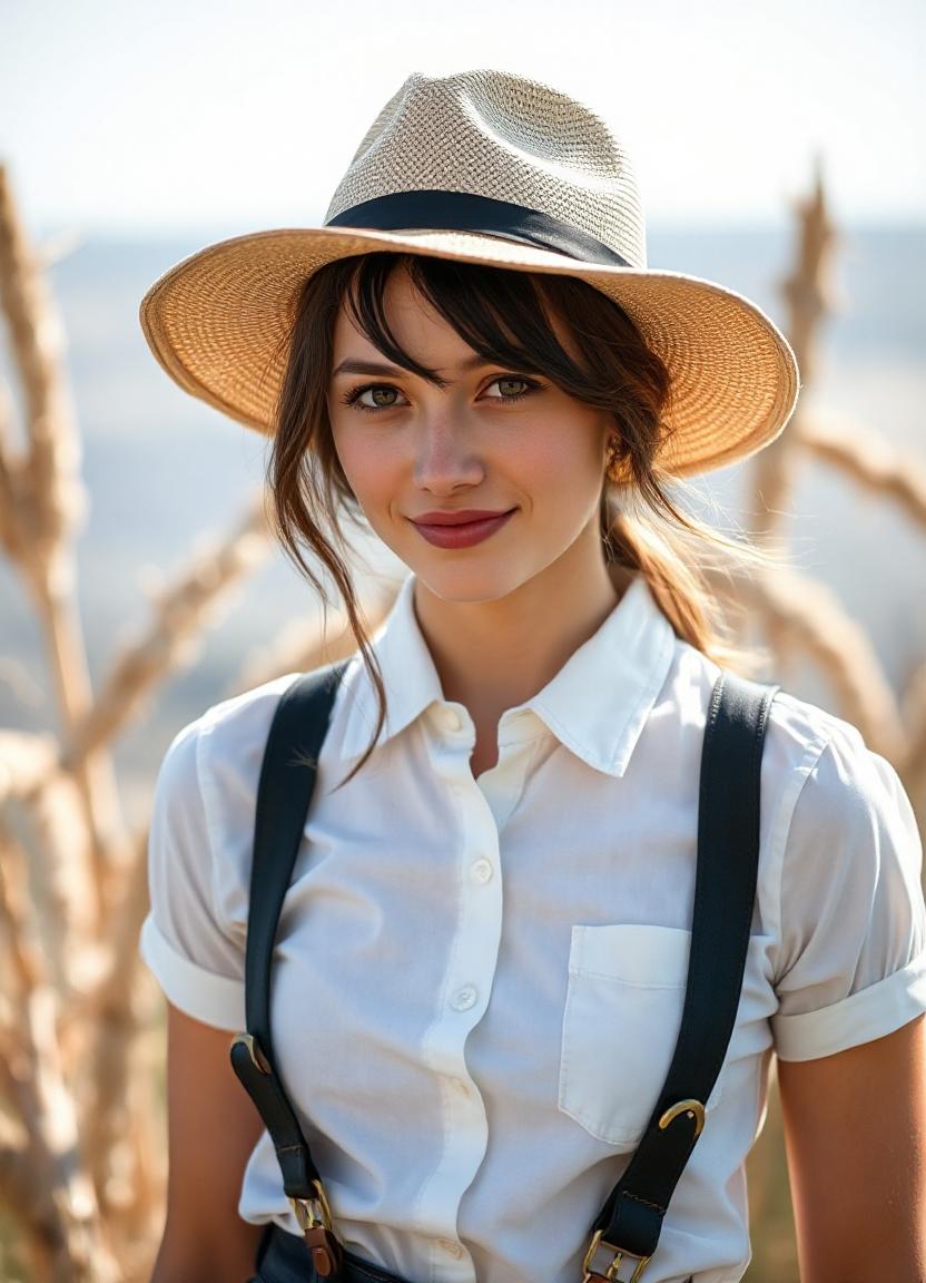 brown, button-down, fashion, field, hair, happy, hat, long, nature, outdoors, portrait, shirt, smiling, straw, summer, sunshine, suspenders, white, wide-brimmed, woman