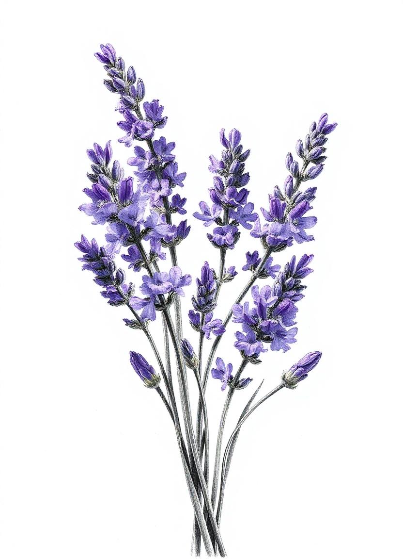 A close-up view of a bunch of lavender flowers, drawn with pencil and colored in shades of purple.