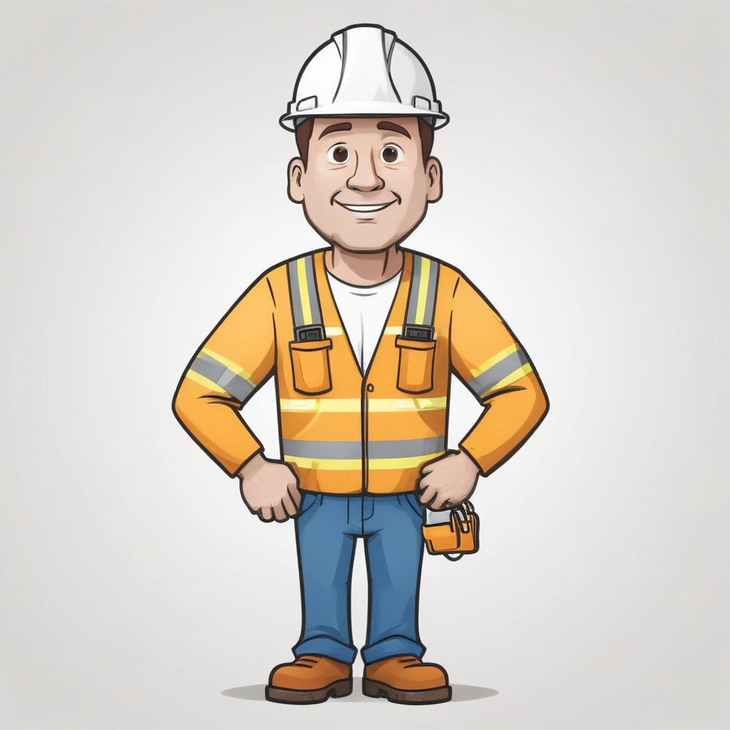 A cartoon illustration of a smiling construction worker wearing a white hard hat, a safety vest, and jeans.