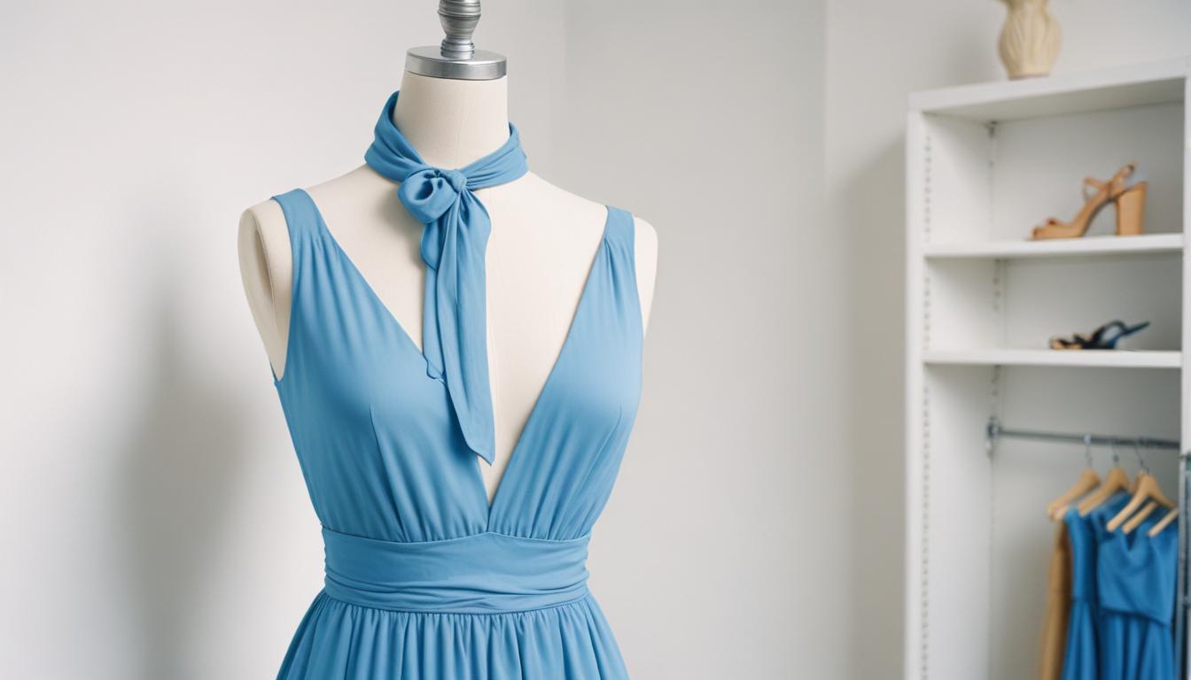 A blue sleeveless v-neck dress with a bow is showcased on a white mannequin against a backdrop of white shelves in a store