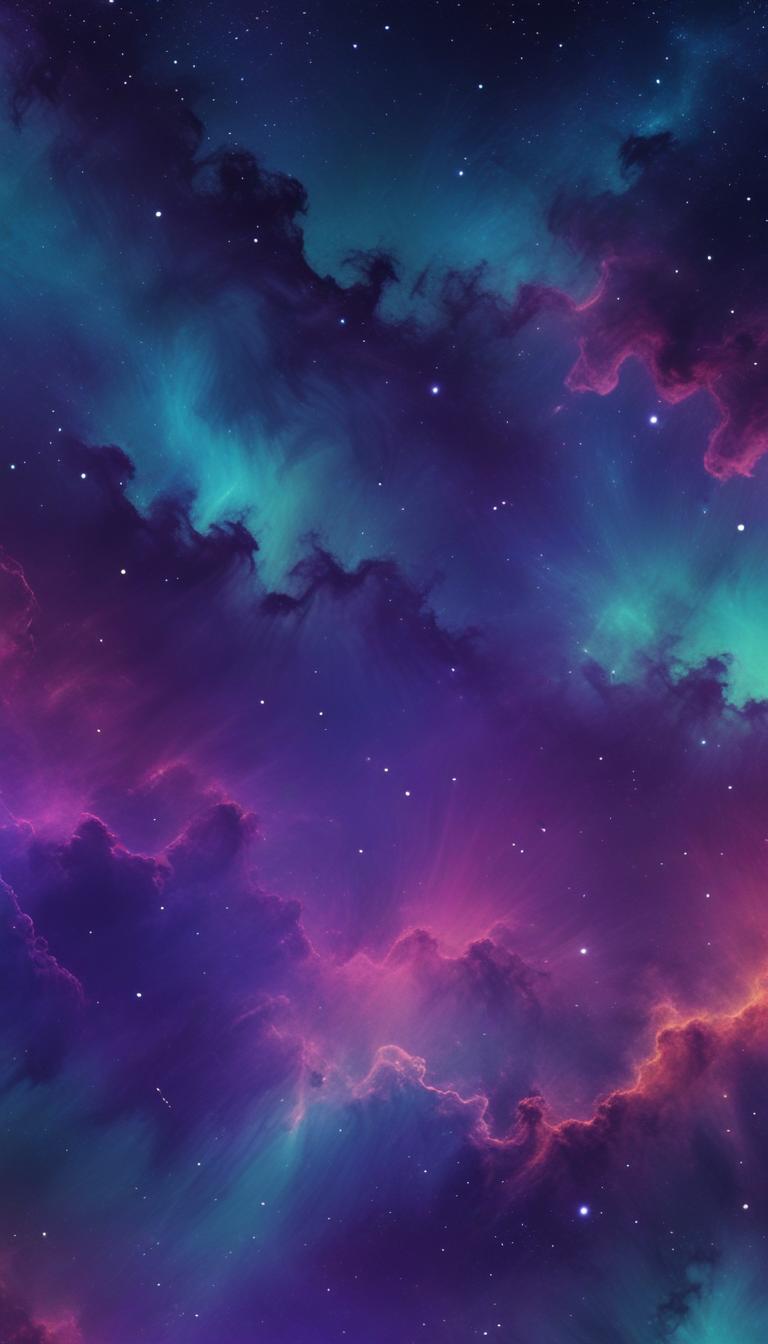 A dark purple sky with white stars scattered throughout. The sky is filled with swirling clouds of blue, purple, and pink.
